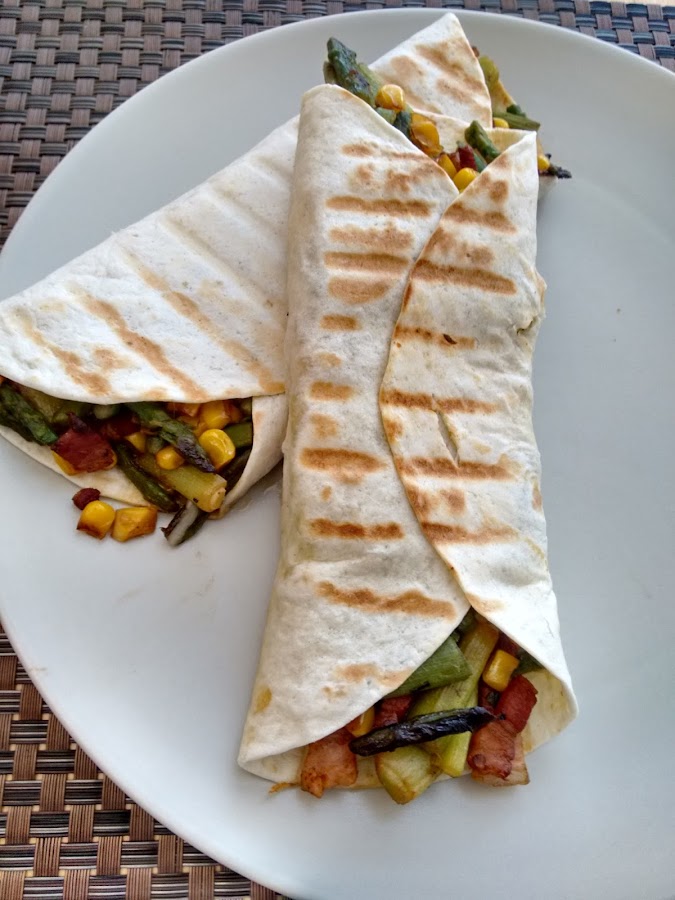 Cogemos una fajita y en medio ponemos el queso para fundir, la cantidad al gusto, yo tampoco eché mucho. Agregamos el salteado de verduras y bacon y enrollamos. Metemos dentro de la plancha doble ya caliente durante un par de minutos hasta que se tueste. Si no tenéis plancha doble se puede hacer en una plancha normal o sartén vuelta y vuelta.