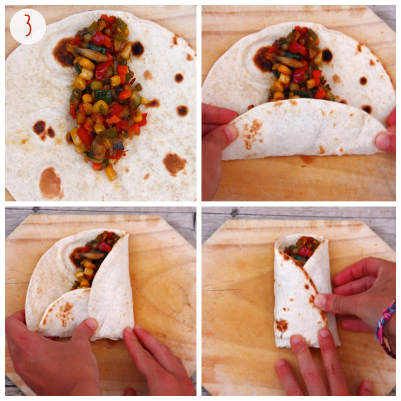 3. Calentamos las tortas de trigo, envueltas en un paño húmedo, durante 15 segundos en el microondas. Montamos la fajita, para ello ponemos el relleno en el centro haciendo una linea gruesa dejando un extremo libre, doblamos por este extremo libre y a continuación por los dos lados. Podemos pasar un segundo por la sartén para cerrarla o ponerle un palillo de dientes.