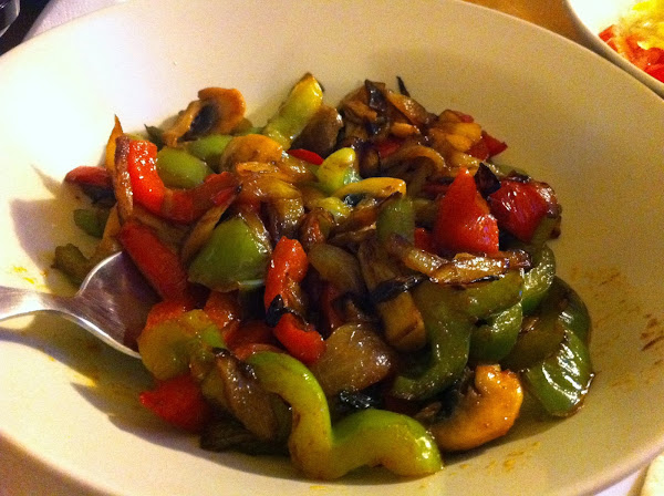 Para preparar nuestras fajitas vamos a preparar dos mezclas diferentes, caliente y fría. En la parte caliente vamos a sofreír cebolla, pimiento verde y rojo, calabacín y berenjena (todo previamente troceado). Podemos añadir sal al gusto y pimentón picante u otra salsa.