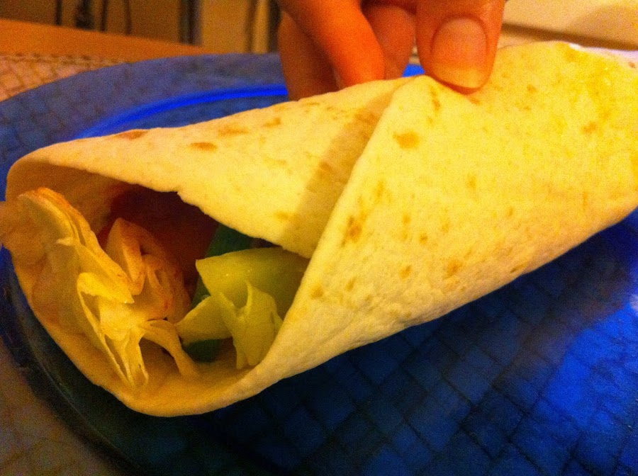 Ya es el momento de prepara nuestra fajita, así que ponemos una tortita en un palato y la rellenamos. Una vez que hemos colocado un poquito de cada mezcla la cerramos.