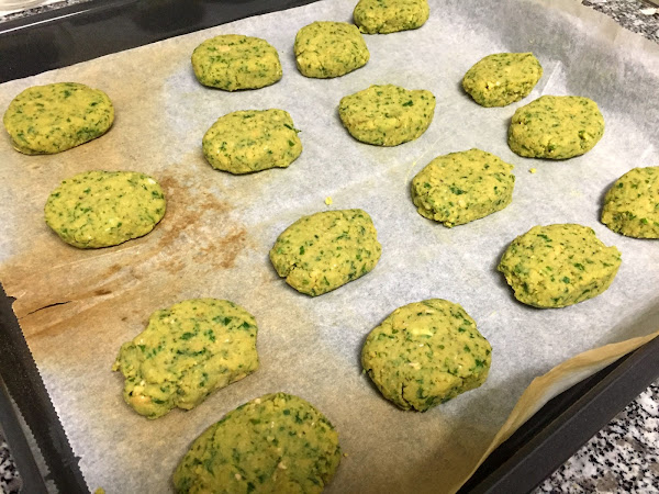 Trituramos todos los ingredientes y hacemos croquetas planas (una bola primero y luego la chafamos). Los vamos colocando sobre papel sulfurizado en la bandeja del horno.