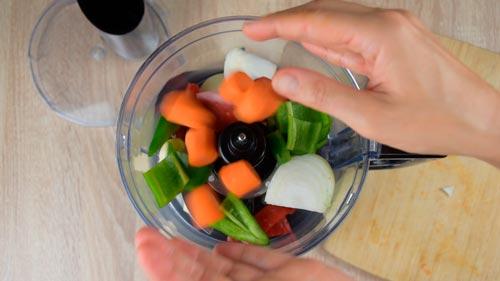 En una picadora o batidora, echamos la cebolla pelada, los ajos pelado, los pimientos rojo y verde, y la zanahoria.
