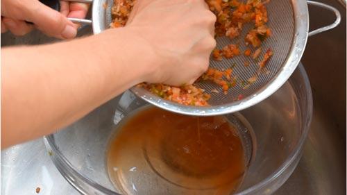 Lo picamos todo muy fino, lo pasamos a un colador y le quitamos todo el agua que pueda tener. Esto es bastante importante para que el falafel nos salga perfecto.