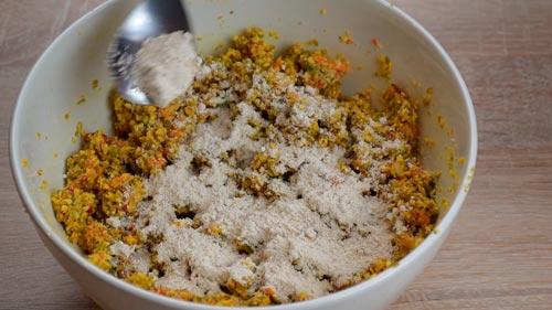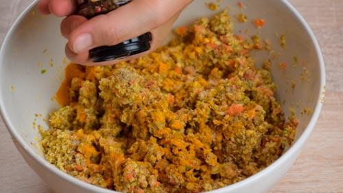 En un bol mezclamos las verduras y las lentejas bien escurridas. Y le agregamos: comino, jengibre en polvo o rallado, cúrcuma, sal y pimienta al gusto.