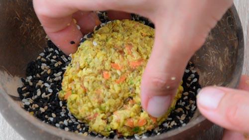 Pasamos cada falafel crudo por unas semillas de sésamo para que se quedan pegadas en la parte de arriba y darle un punto crujiente al masticar.