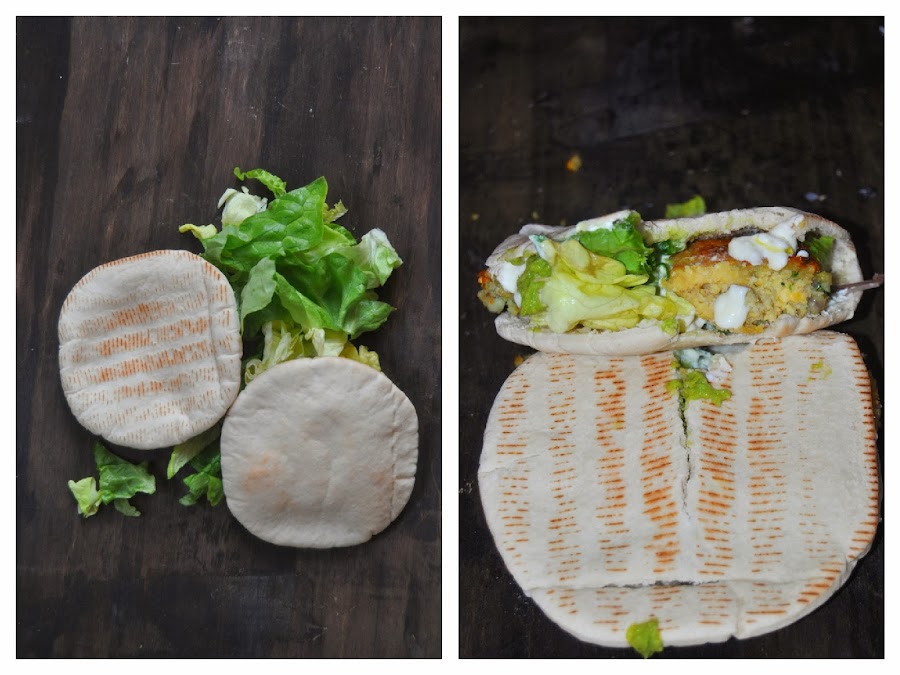 Para terminar el plato, cogemos el pan de pita, lo calentamos un minuto en el microondas para facilitar su apertura. Abrimos y ponemos al fondo un poco de salsa de yogur, luego hojas de lechuga variada, más salsa y dos falafel terminando con más salsa al gusto.