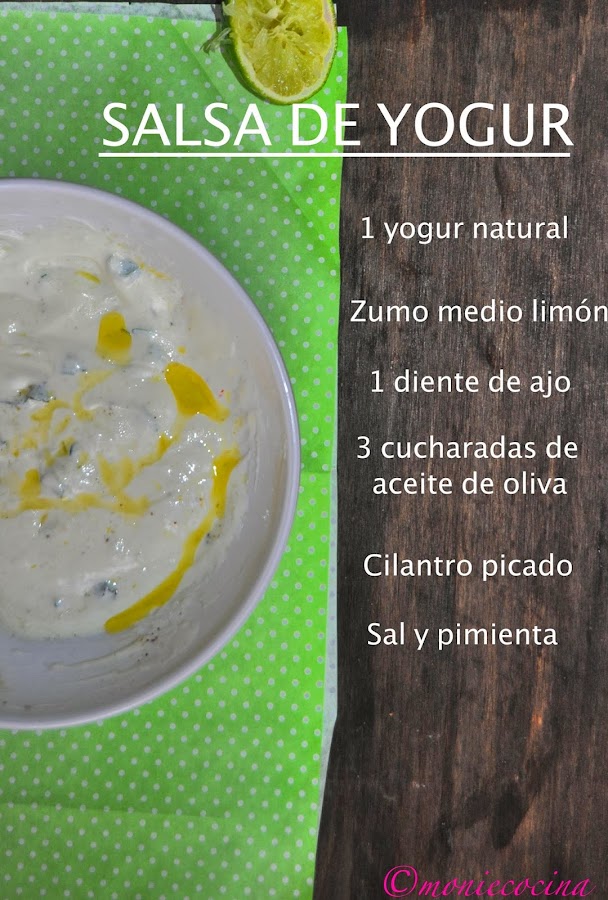 Para preparar la salsa de yogur, en un bol mezclamos el yogur natural, un diente de ajo rallado, zumo de medio limón o lima, el aceite de oliva, sal y pimienta. Podeis añadirle menta, perejil o en mi caso cilantro picado que da un sabor estupendo. Mezclamos y listo para servir,