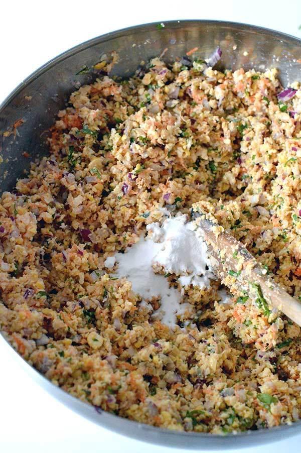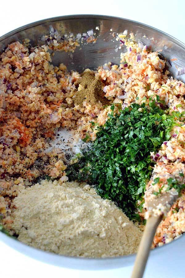 Ponemos en la mezcla también la harina de garbanzos, el agua, la sal y pimienta, el comino y la cayena molida! Mezclamos todo bien.