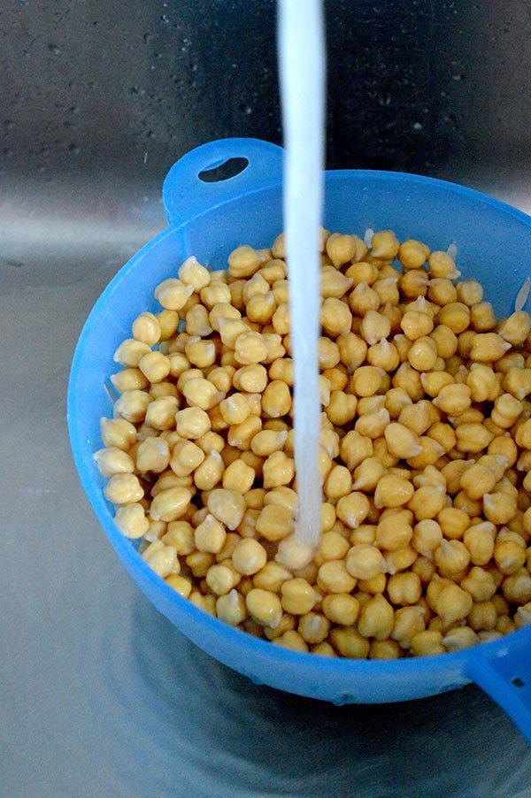 Lo primero de todo la noche anterior en poner los garbanzos en remojo. Los lavamos bien debajo del grifo.