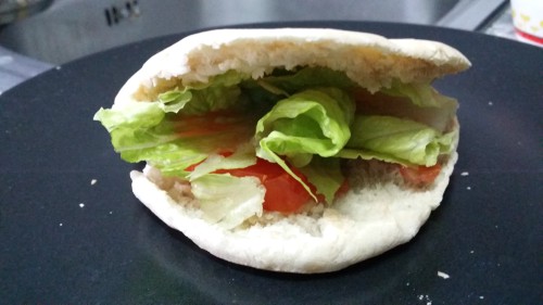 Se calienta el pan de pita en la tostadora, se abre y se añade el tomate y lechuga,
