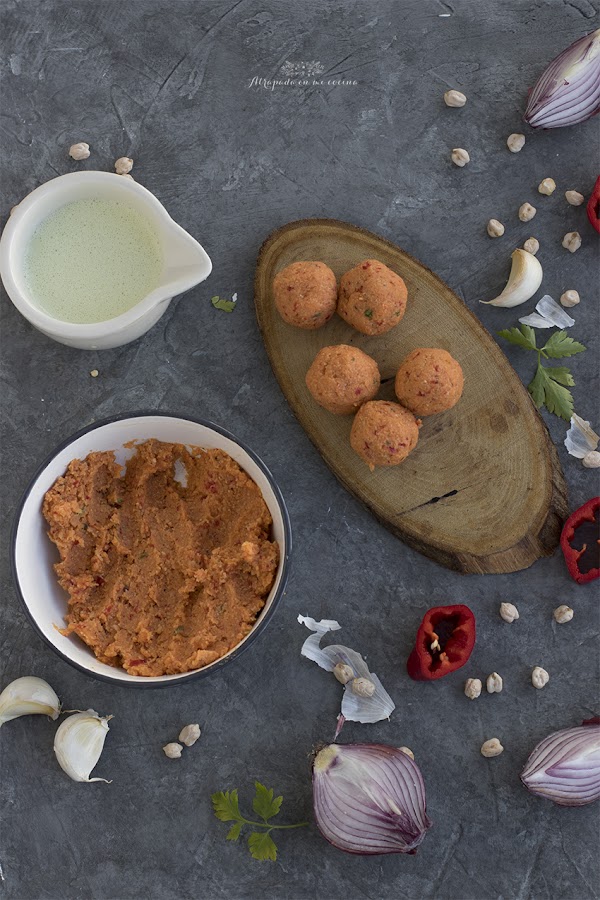 Escurrimos los garbanzos del exceso de agua. Ponemos en el vaso de la batidora o de nuestro robot, trituramos. Añadimos el ajo, la cebolla, el pimiento, el cilantro, el perejil, el comino, la sal y la pimienta, y trituramos todo. Añadimos pan rallado para espesar la mezcla y que después sea fácil hacer con la masa bolitas (no os pongo cantidad exacta porque eso dependerá de vuestra masa). Tapamos la masa y dejamos reposar durante una hora como mínimo en la nevera.