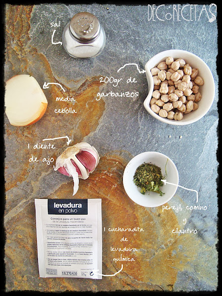 Pondremos en remojo los garbanzos un mínimo de 24 horas. Pasado el tiempo los trituramos junto con el resto de ingredientes: la cebolla, el ajo, la levadura, el cilantro y perejil, y en mi caso, un poco de comino.
