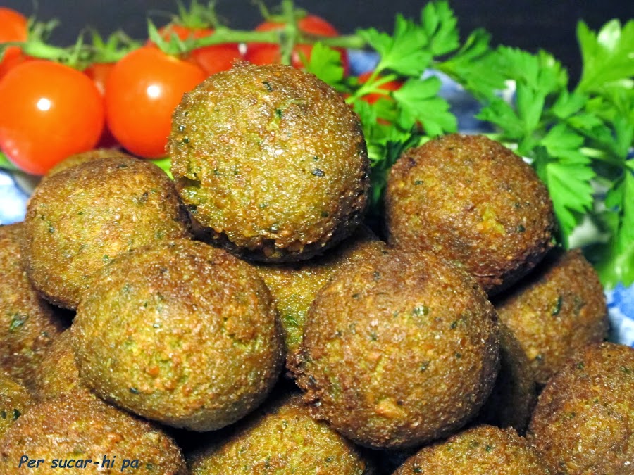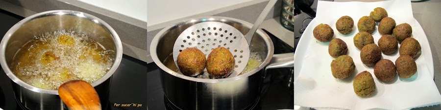 Colocar abundante aceite en una cazuela y calentar sin que llegue a humear. Freír las bolas de faláfel, primero por una cara y después por la otra hasta que queden de un color tostado. No poner muchas a la vez para evitar que baje la temperatura del aceite. Retirarlas y ponerlas a escurrir en un plato sobre papel de cocina. Y ya están listas para servir.