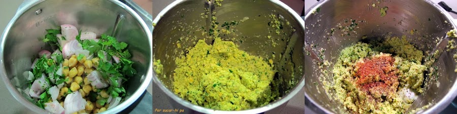 Colocar en la picadora los garbanzos, la cebolla, el ajo, el perejil y el cilantro. Triturar y verter en un bol. Añadir el resto de ingredientes, bicarbonato, comino, sal, pimienta y la cayena si queremos un punto picante. Mezclar bien hasta que la masa resulte homogénea.