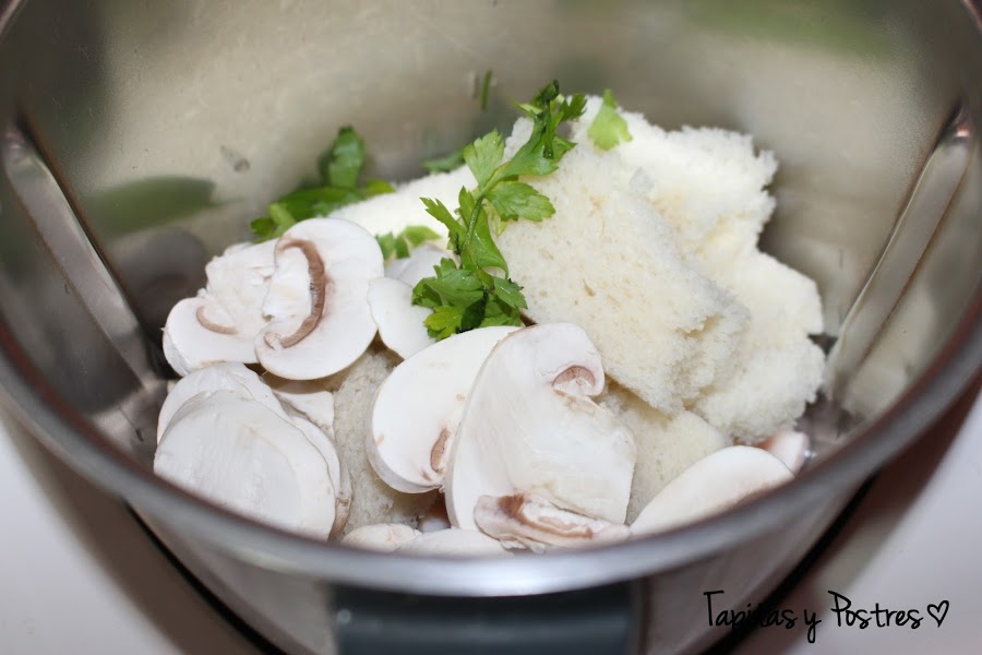 Ponemos en el vaso de la thermomix el jamón y lo trituramos 15 segundos a velocidad 5. Agregamos los champiñones, el pan y el perejil y volvemos a triturar 15 segundos a velocidad 5. Añadimos el huevo, la sal y la pimienta y mezclamos 30 segundos a velocidad 5.