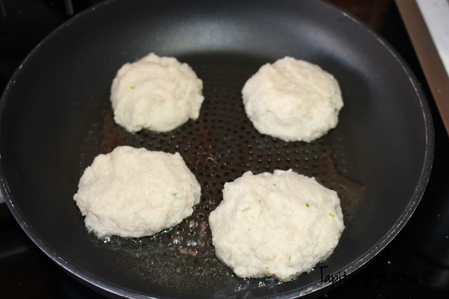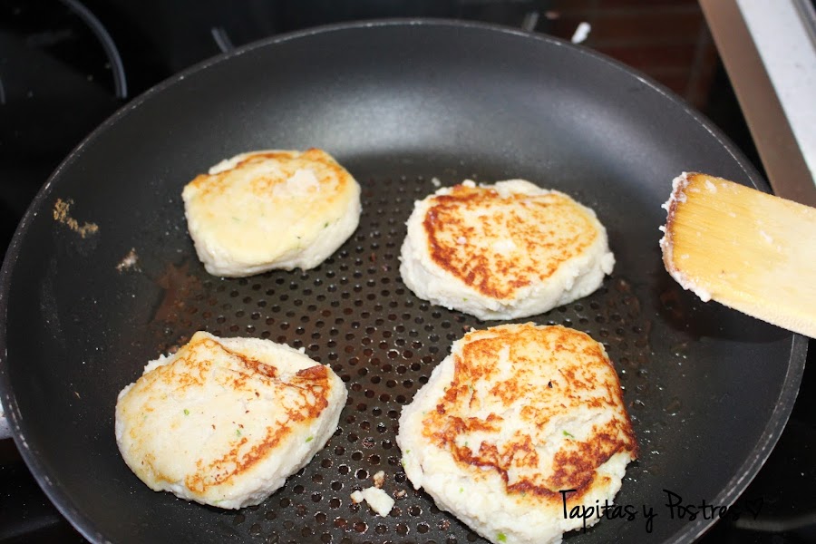 Cogemos porciones pequeñas (las mias son del tamaño de unos mini panecillos) y las cocinamos en una sartén a fuego suave para que se hagan por dentro bien. Yo las hice algo gordas, quedan muy bonitas pero es mejor que sean más finas.