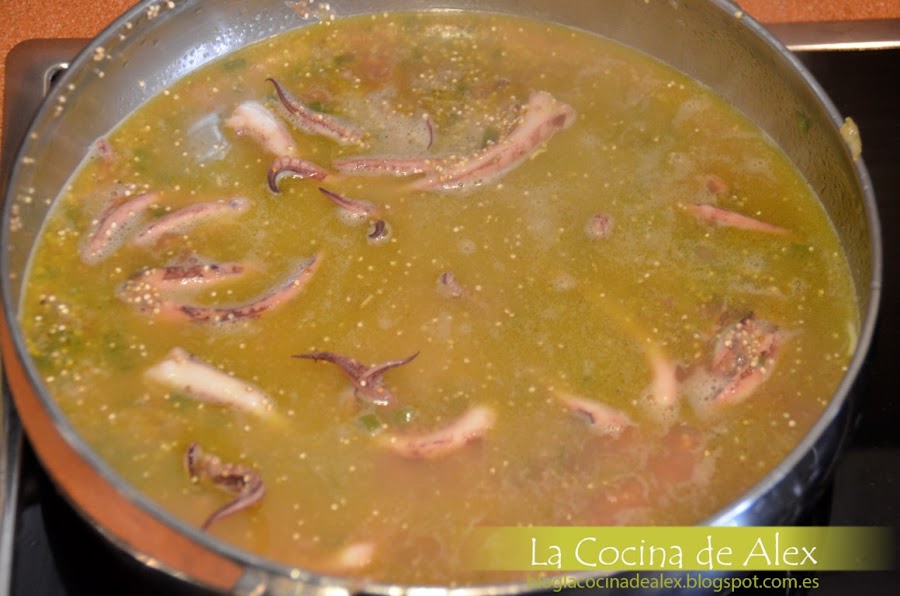 Cortamos el calamar en trozos medianos y lo agregamos a la verdura para cocinarlo durante unos minutos. Podeis usar lo que más os guste, yo he usado rejos pero podéis usar calamar entero, sepia, pulpo, etc...