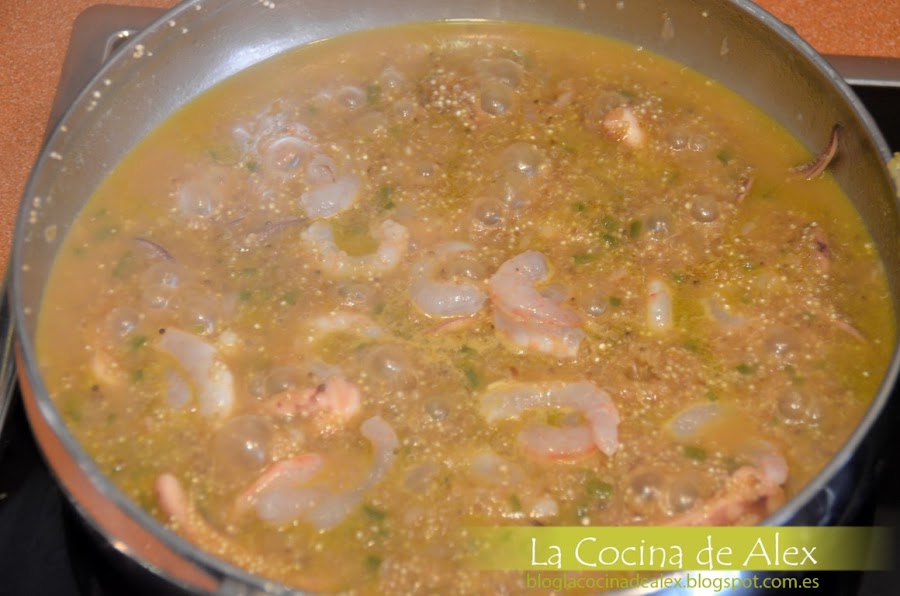 A continuación lavamos la quinoa bajo el grifo con abundante agua hasta que este muy limpia y lo incorporamos a la sarten sofriendo todo junto para que coja todos los sabores del sofrito.