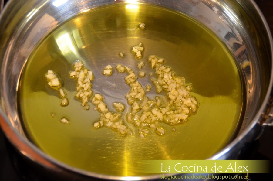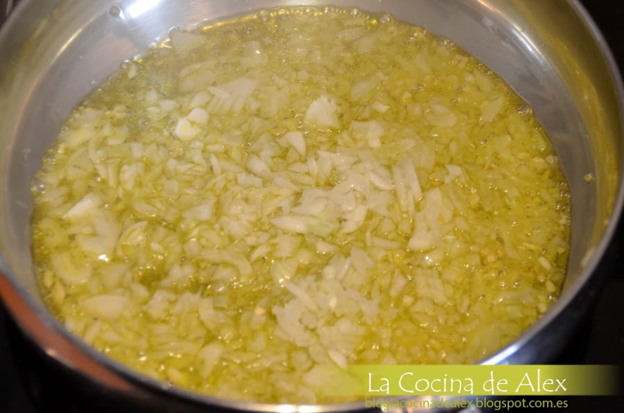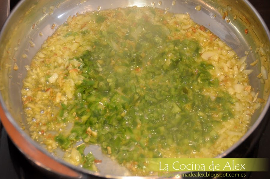 En una sarten con un poco de aceite de oliva, sofreímos las verduras, primero el ajo, la cebolla y por último el pimiento pochando todo junto hasta que este bien dorado.