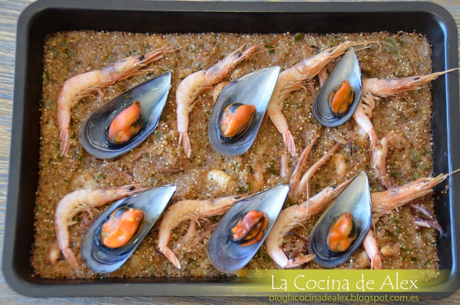 Para terminar la elaboración, precalentamos el horno a 200ºC. Cuando la quinoa este casi al punto la pasamos a una bandeja de horno le ponemos por encima la gamba sin pelar y los mejillones. Horneamos 5-10 minutos hasta que quede seca nuestra paella y un poco dorada del horno. Este paso es totalmente opcional y si teneis una sarten u olla apta para el horno no hace falta que cambies de recipiente la quinoa.