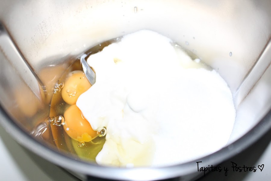 Ponemos todos los ingredientes en el vaso, huevos, azúcar, yogures...