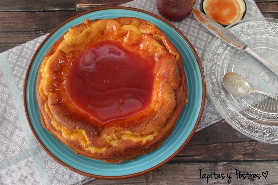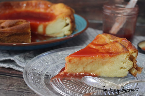 La verdad, es que al probarla, si no sabes cuales son los ingredientes, te parece una tarta de queso. Tiene incluso esa hondonada característica de las tartas de queso, ideal para rellenar de mermelada. Pero todos sus ingredientes son vegetales, yogur y margarina de soja y leche de almendras. Si no fuera porque lleva huevos, sería un postre vegano.
