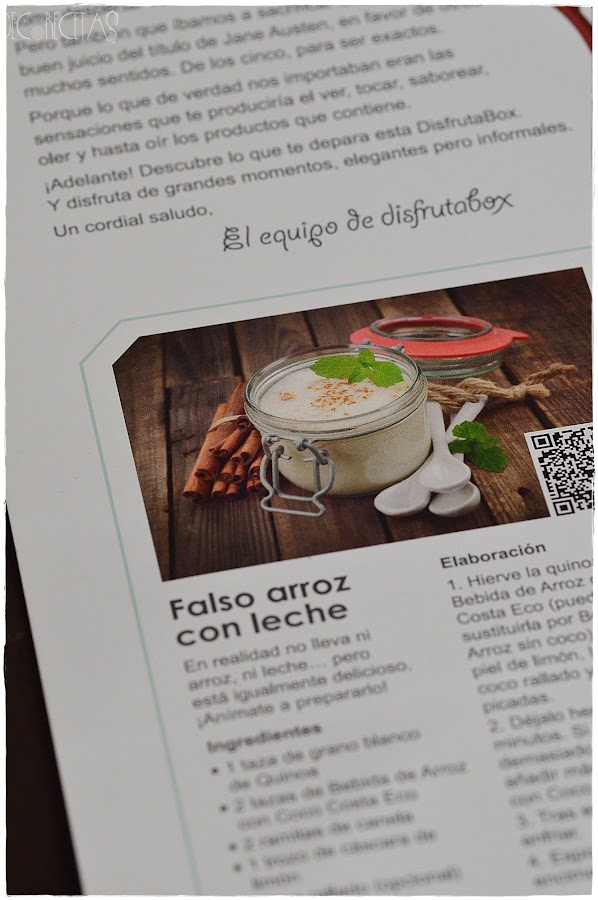 Cómo podéis ver en la siguiente imagen, esta receta nos la proporcionaron desde la cajita Disfrutabox, de la que es esta bebida de arroz con coco,y no quise desaprovecharla. como siempre, os puede costar 9,95e la primera cajita con mi código :DECORECETAS