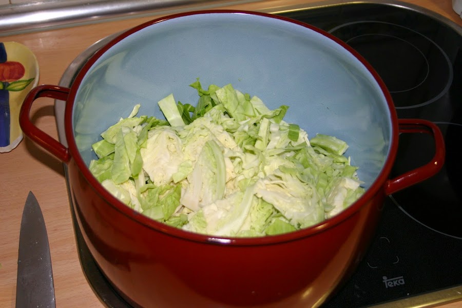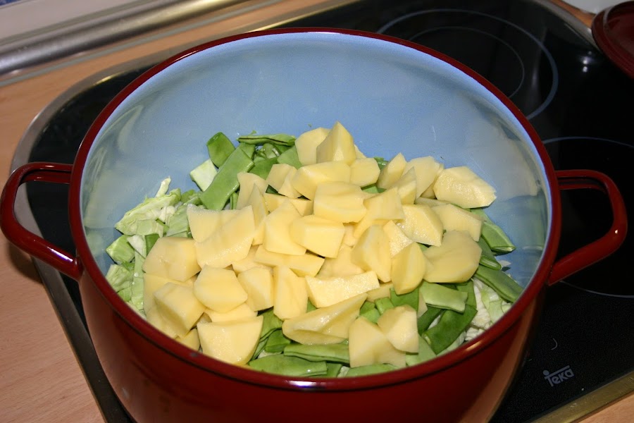 partimos lapatata en trozos pequeños y a la cazuela, si, desde el principio, asi se va deshaciendo y le da cuerpo al caldo
