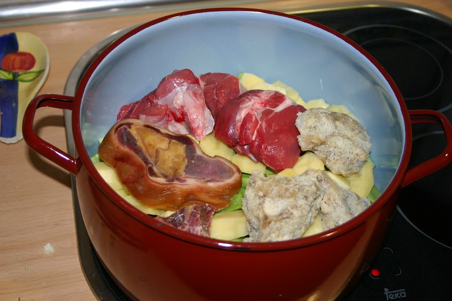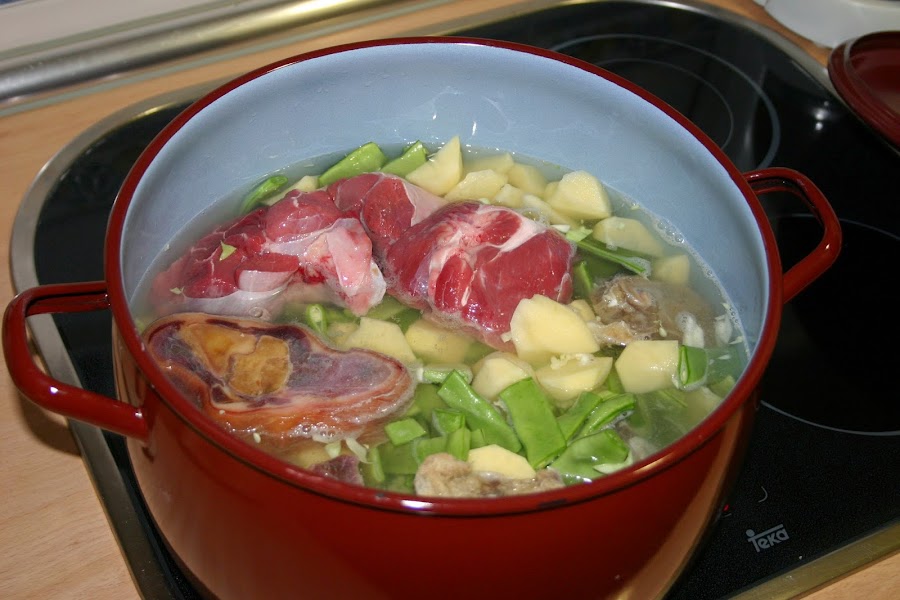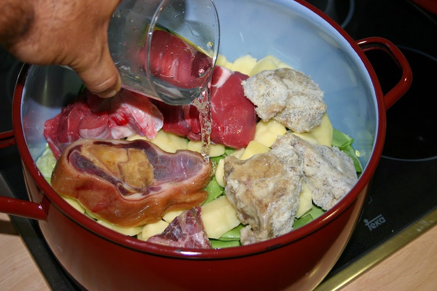 subimos el fuego hasta que hierva, una vez empieze a hervir lo bajamos a fuego medio y tapamos la cazuela, lo dejamos cocer al menos un par de horas para que coja buen gusto de todo
