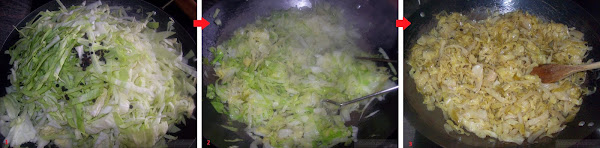 Vamos dejando que vaya cocinándose poco a poco. Irá perdiendo el volumen a medida que el repollo suelte agua.