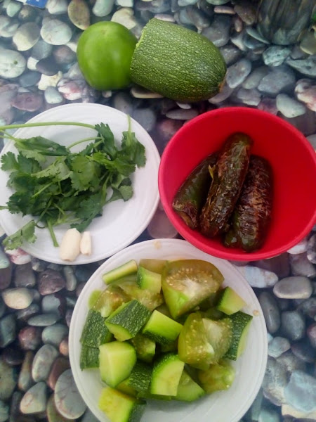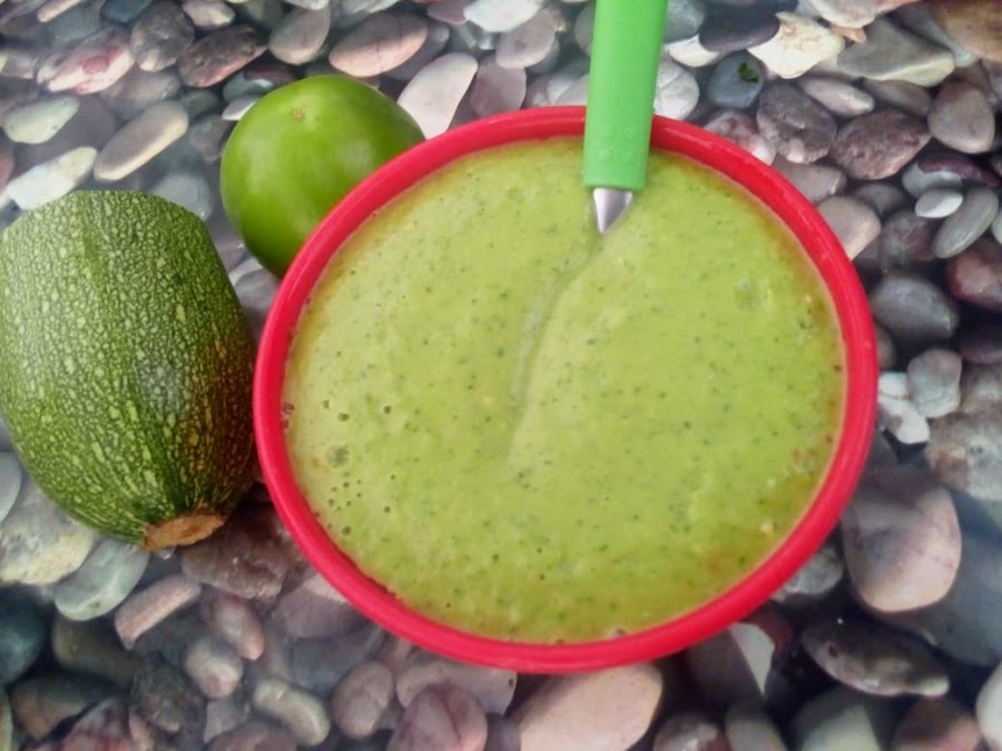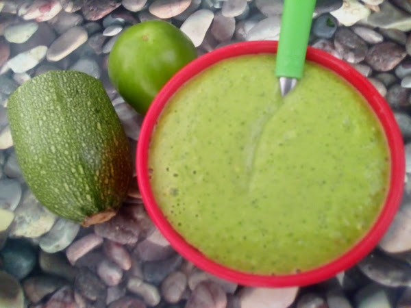 Poner a licuar los tomates hervidos, la calabacita, los chiles fritos, el cilantro, ajos, crema, sal al gusto, también ponerle el aceite en el que freíste los chiles. Licuar.