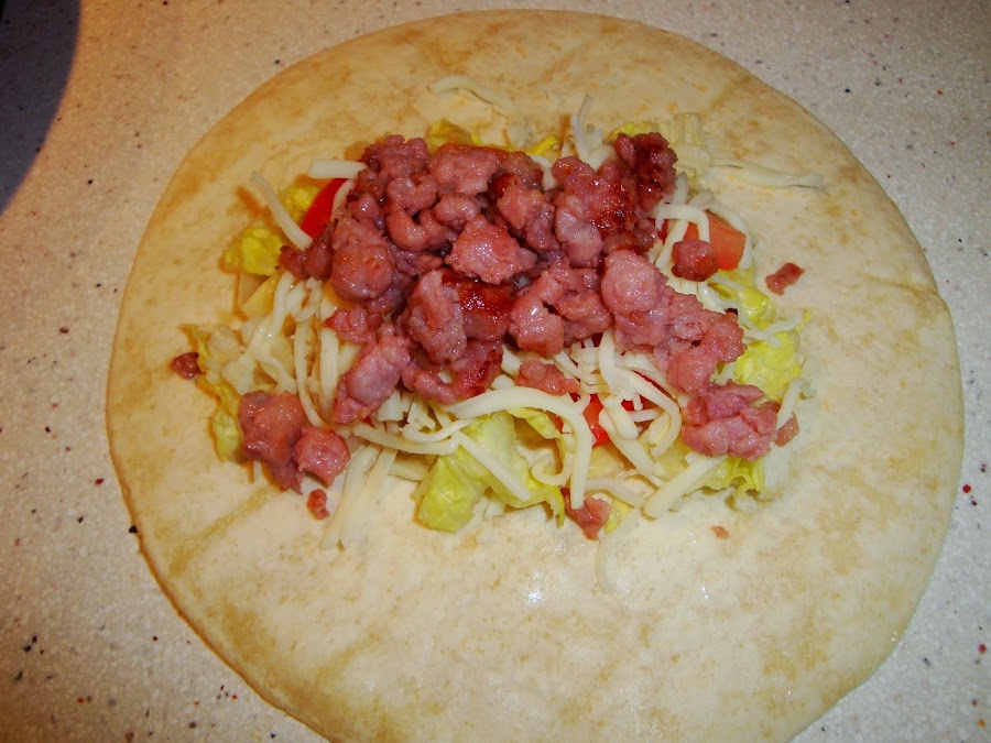 Cuando lo tenemos todo preparado ponemos una tortita y echamos un poco de lechuga, tomate, queso mozzarella, salchichas y salsa yogurt. Todo al gusto