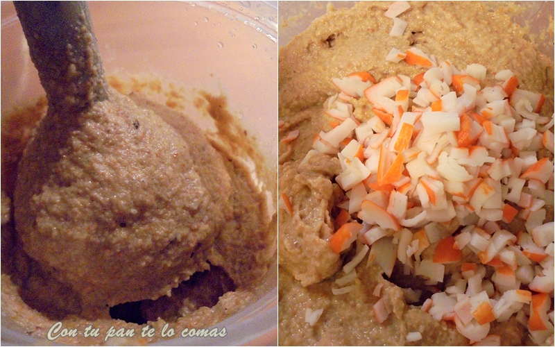 2. En el vaso de la batidora ponemos los mejillones, las anchoas troceadas y los palitos también troceados en la proporción que antes comenté, uno de cada. Además añadimos el huevo duro, la mayonesa, el queso y el ketchup. Trituramos todo junto y terminamos el paté añadiendo algunos palitos más picados muy menudo que hará que tenga una textura más gruesa (yo le puse tres). Mezcla bien y ponlo en un recipiente cerrado para guardarlo en la nevera.