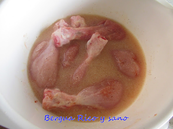 3. Introducimos la carne sin piel en el suero de manera que quede cubierta, tapamos el recipiente y lo dejamos marinar 6-8 horas en la nevera. A las 3-4 horas removemos para que los trozos de la superficie pasen al fondo.
