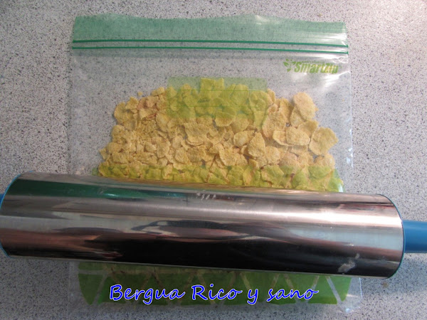 4. Metemos los cereales en una bolsa de plástico y los trituramos con un rodillo. Tienen que quedar reducidos a trocitos, no pulverizados.