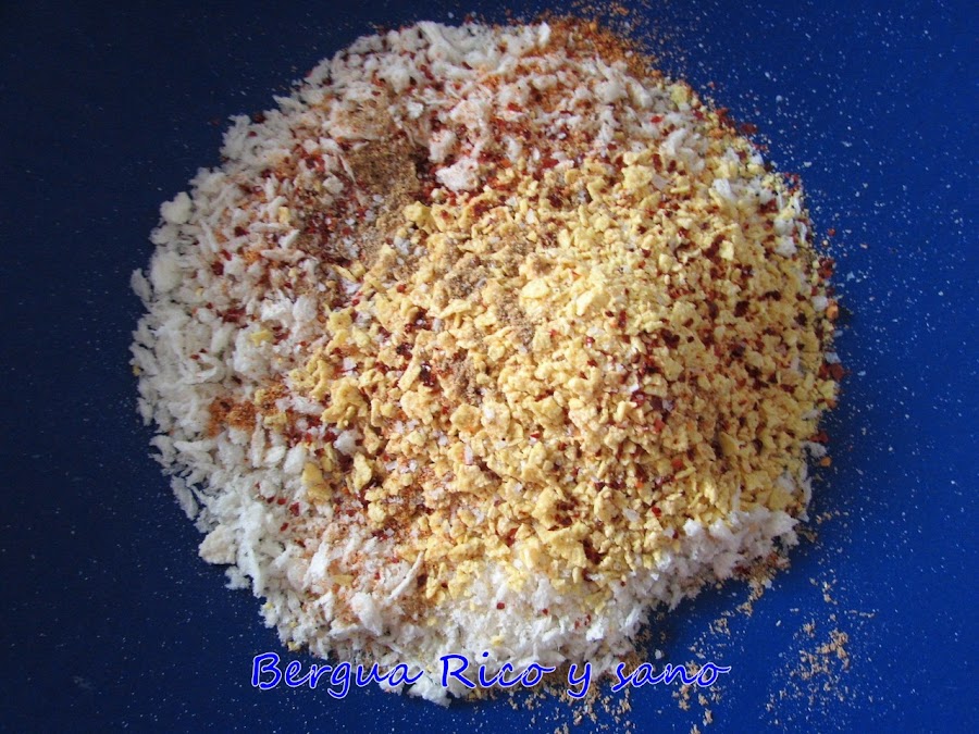 5. Para preparar la mezcla del rebozado, simplemente mezclamos bien el panko, los cereales (copos de maíz), el sazonador para tacos, sal, cilantro y gundilla.