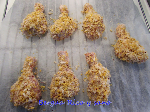 6. Rebozamos cada muslo de pollo estrujando para que se pegue la mayor cantidad posible de la mezcla.
