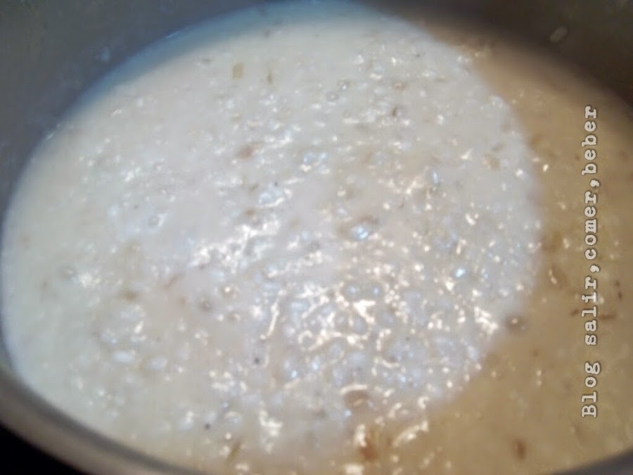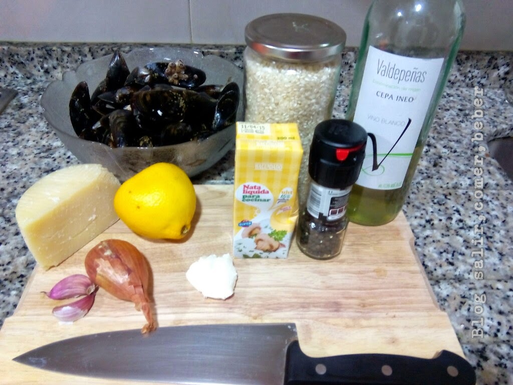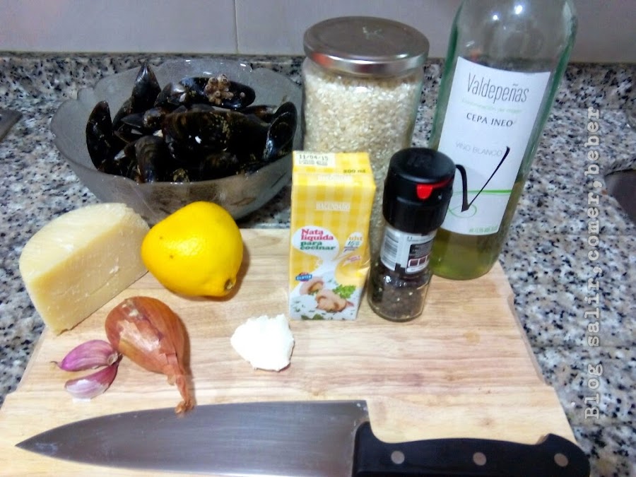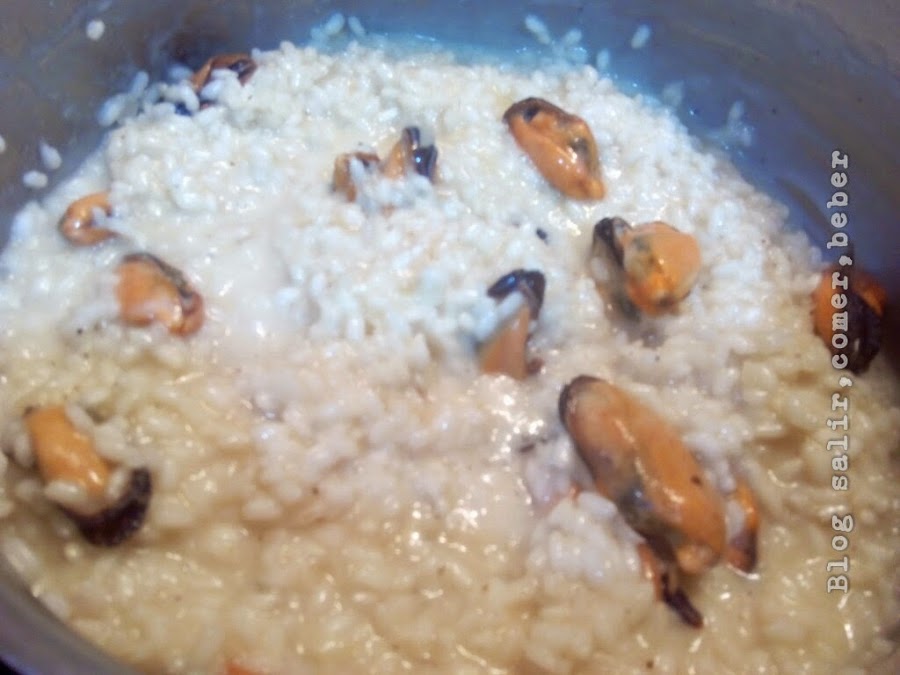 Cuando el arroz empiece a estar al dente, añadimos un chorro de nata (crema de leche) y queso rallado, nosotros hemos elegido un queso manchego para darle un toque ibérico a la receta, seguimos removiendo y cuando el arroz esté al punto que nos guste, espolvoreamos generosamente pimienta negra y añadimos los mejillones.