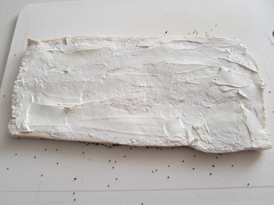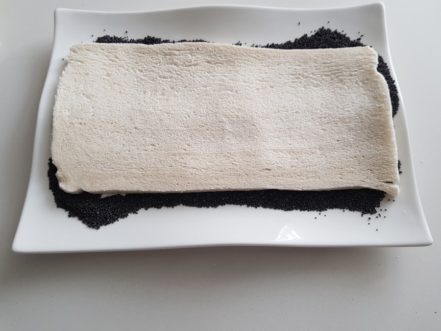 2. - Poner un plato con semillas de amapola y colocar la parte untada boca abajo, para que se peguen las semillas de amapola.