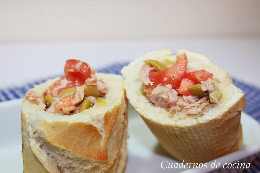 La cosa es así de simple, le dices a uno de tus hijos que agujeree el pan y lo rellenas de lo que más te guste.Yo en este caso de una "ensalada" de atún. Y mientras se entretiene con la miga (es lo que hago yo para que Miguel me deje cocinar....), apañas la cena en un pis-pas.