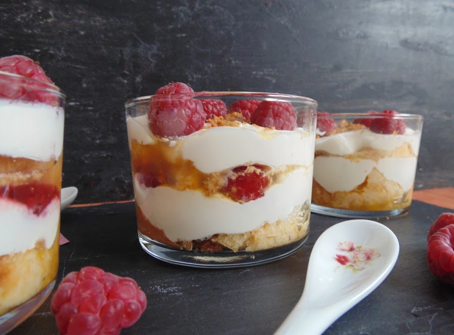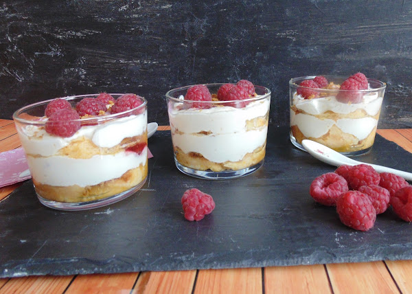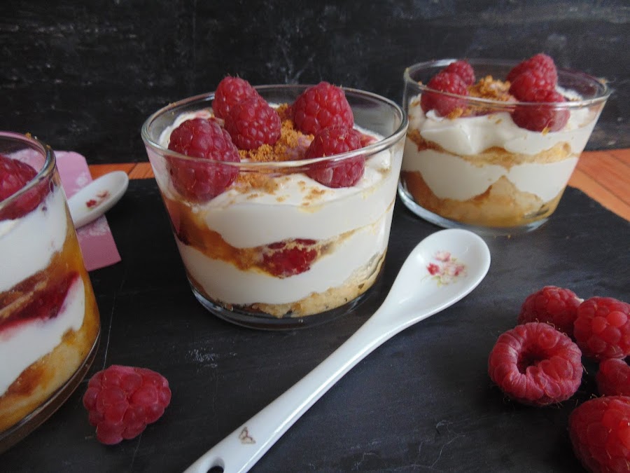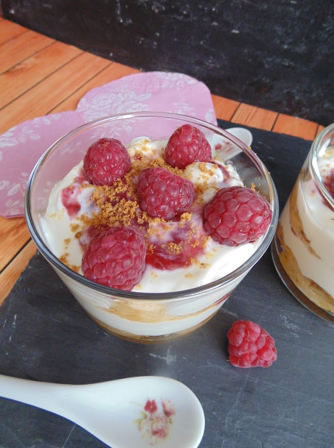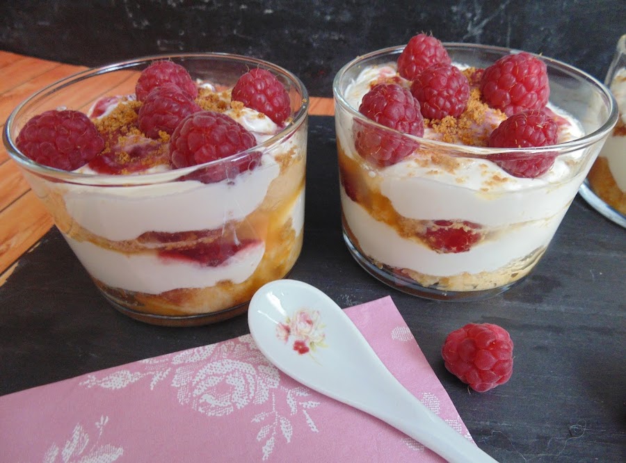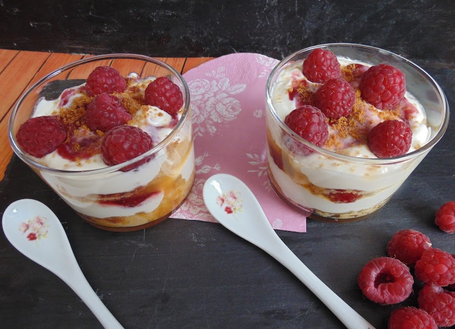 Mezclamos el mascarpone con los dos yogures y unas gotas de vainilla líquida. Si los yogures no son azúcarados podemos agregar dos cucharas de azúcar (a vuestro gusto). Vertemos la mitad de esta preparación sobre las frutas, en cada vasito. Ponemos otra capa de bizcocho mojado en zumo de naranja, el resto de las fresas y lo que queda de la mezcla de mascarpone y yogur. Finalmente trituramos las galletas para ponerlas de adorno por encima y darle un toque crujiente y especiado y terminamos decorando con el resto de las frambuesas. Lo llevamos a la nevera y lo servimos bien frío. Fácil, fresquito y delicioso.