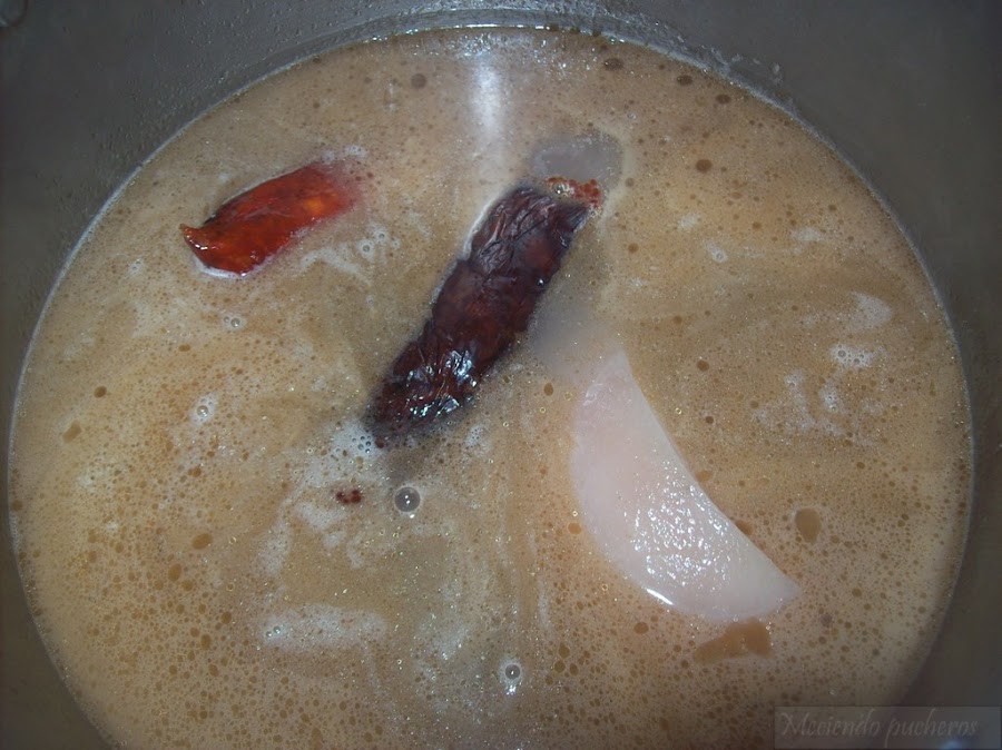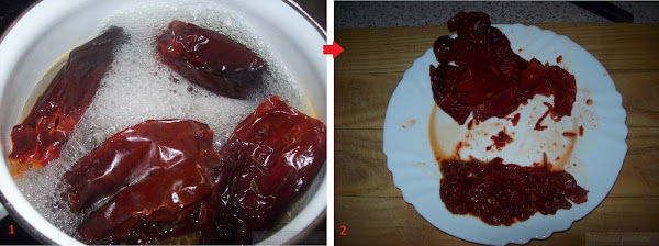 Hay que aprovechar éste tiempo de cocción de la oreja para escaldar los pimientos choriceros. Para ello los cocemos 3 ó 4 minutos en agua hirviendo. Una vez escaldados les extraemos la carne y la reservamos.