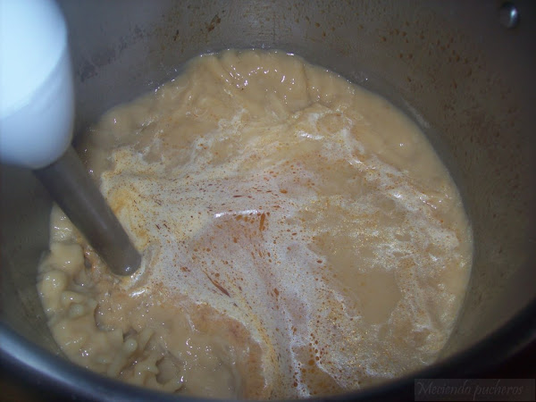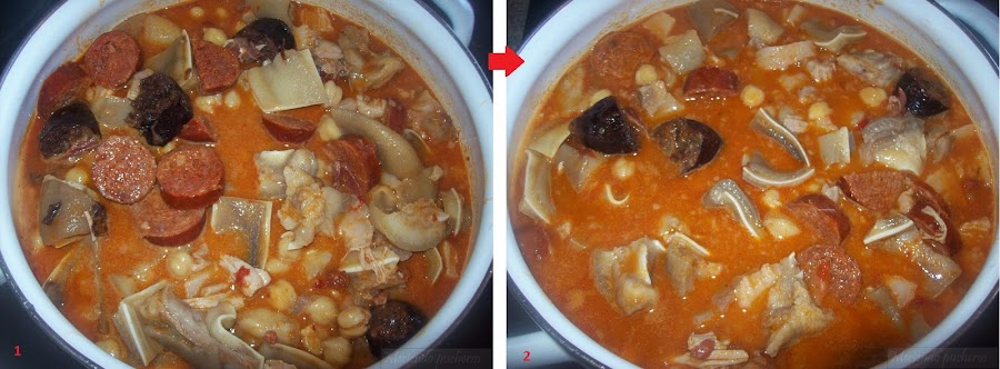 Añadimos la morcilla y el chorizo troceados al guiso (que en estos momentos apenas tiene salsa) y le vamos añadiendo el agua de cocer los pimientos choriceros y el caldo de la cocción que hemos pasado por la turmix para ir incorporando líquido. Vamos dejando a fuego medio todo el conjunto añadiendo caldo si vemos que se nos queda muy seco hasta conseguir la textura gelatinosa deseada. Nos bastarán unos 10 minutos mas o menos.