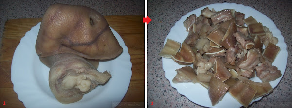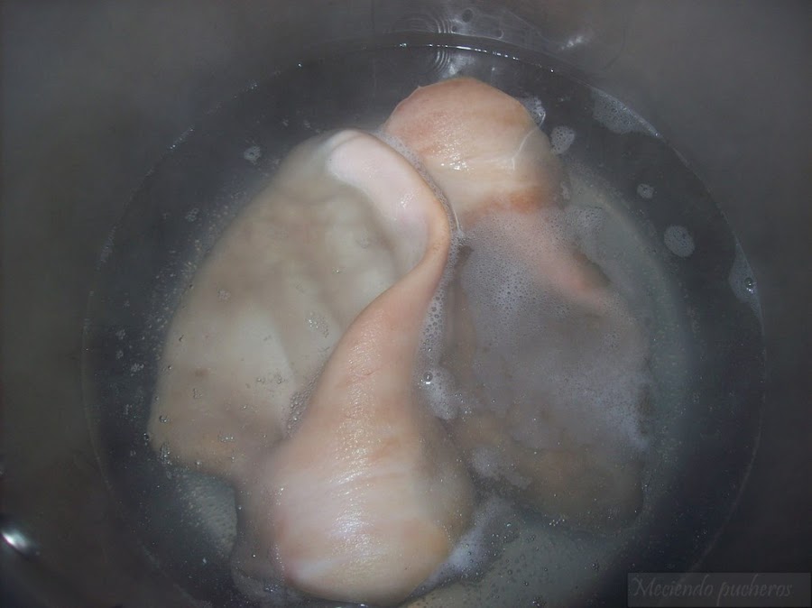 Mientras hemos hecho todo esto,habrán pasado esos 45-50 minutos para que la oreja esté hecha. En ese momento, abrimos la olla, retiramos la oreja y la troceamos.