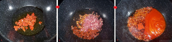 Mientras todo ésto lo tenemos en marcha, podemos aprovechar para ir haciendo el sofrito. Teníamos otro chorizo distinto (que puede ser cualquiera) al que le hacemos trocitos. Ponemos una sartén con un chorrito de aceite de oliva y añadimos el chorizo. Dejamos que sude un poquito ahí y entonces agregamos los taquitos de jamón. Rehogamos todo junto y añadimos el pimentón dulce y picante (una cucharadita de cada uno, según el gusto de cada uno) y medio vaso de tomate frito.