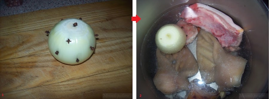 Volvemos a llenar la olla con agua fría y metemos la oreja de cerdo, el hueso de jamón y el de rodilla, el trozo de papada de cerdo. La cebolla pinchada con 8 -10 clavos de olor, la zanahoria y el diente de ajo se introducen enteros.