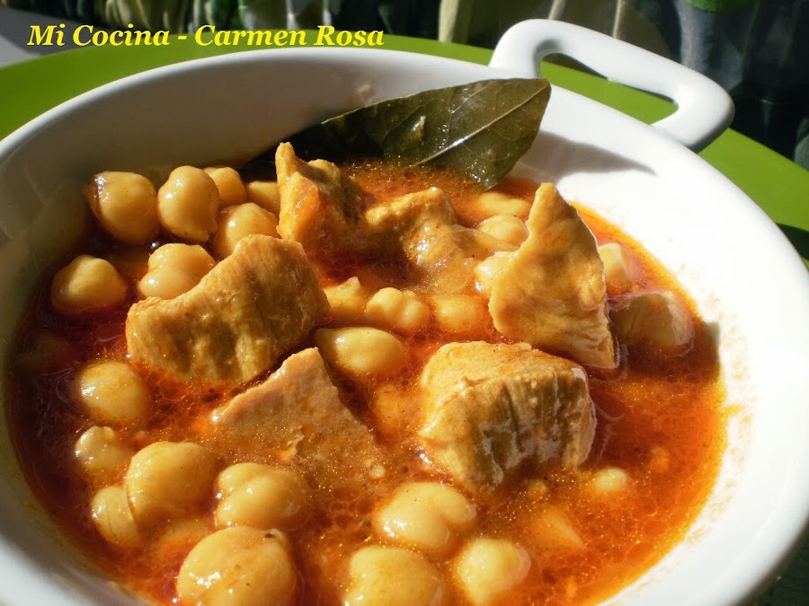 Medio kilo de garbanzos blancos (lechosos) puestos en remojo en agua con sal el dia anterior (unas ocho horas aproximadamente), medio kilo de magro de cerdo (cortado en trozos no muy pequeñitos), un trozo de tocino con panceta cortado en trozos pequeños, una cabeza de ajos, un tomate maduro, media cebolla, diez o doce clavos de olor (especia), diez o doce granos de pimienta negra, una rama de canela, una guindilla roja pequeña (si no se quiere un poco picante se puede suprimir), una cucharada pequeña de pimentón (pimiento molido dulce), una carterilla de azafrán (colorante alimentario, uso la marca el Aeroplano, tal y como hacia mi madre), un cucharón de aceite de oliva virgen extra (he usado de Riogordo, sin filtrar, malagueño), dos hojas de laurel, sal y agua.