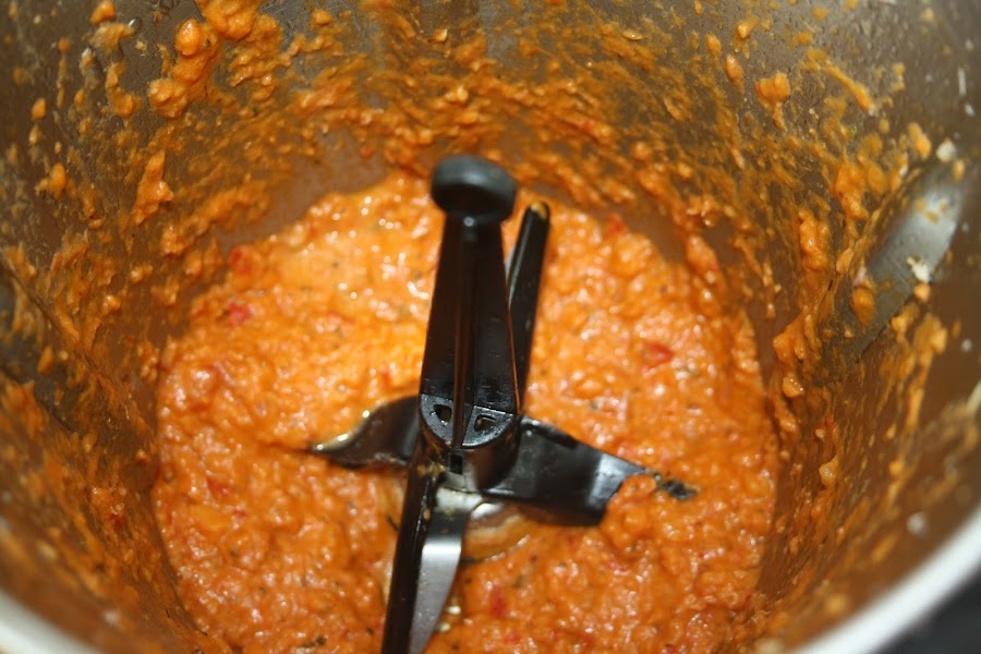 6. Cuando pite, retiramos el relleno y limpiamos el vaso con una lengua de silicona lo mejor que podamos para preparar la bechamel (no es necesario limpiarlo con agua y jabón, la única diferencia es que la bechamel saldrá ligeramente teñida del color del relleno).