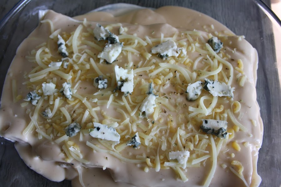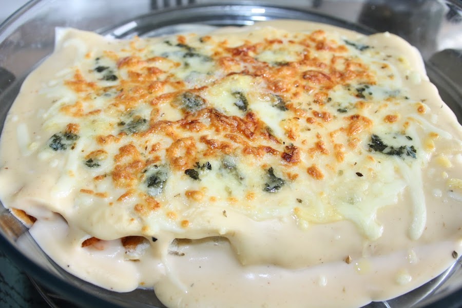9. Colocamos un poco de bechamel en la base de la fuente en los que vayamos a gratinarlos. Sobre ésta, añadimos los canelones un pelin separados entre si. Cubrimos con bechamel y queso rallado y los taquitos de roquefort.