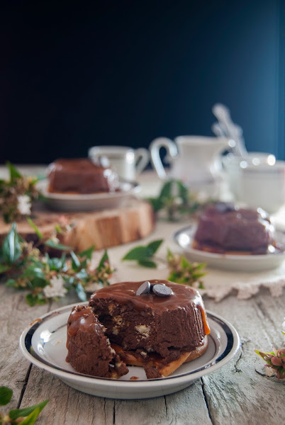 - En unos moldes para flan, vertemos una cucharada de caramelo en el fondo, y lo dejamos enfriar unos minutos en la nevera. Después es el turno de poner una buenas cucharadas de ganache de chocolate y galleta. Seguidamente volvemos a verter una cucharada de caramelo y finalmente, colocamos una galleta y los trocitos que necesitemos para hacer la base de los falsos flanes.
